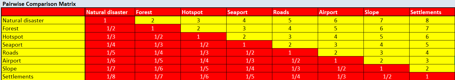 Before performing site selection, we will have to first conduct Analytical Hierarchical Process (AHP) analysis to determine which criterias should be prioritized for decision making.
