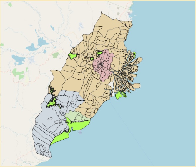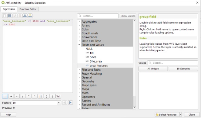 After performing AHP analysis, we have derived a layer with suitable sites highlighted in green as shown in figure 4. To narrow down these areas, we first check if each of these suitable sites meet the size requirements. As we have calculated the area of each of these polygons in hectares, we can simply use the identify tool to confirm whether or not the polygons are within 4500 to 5500 hectares.