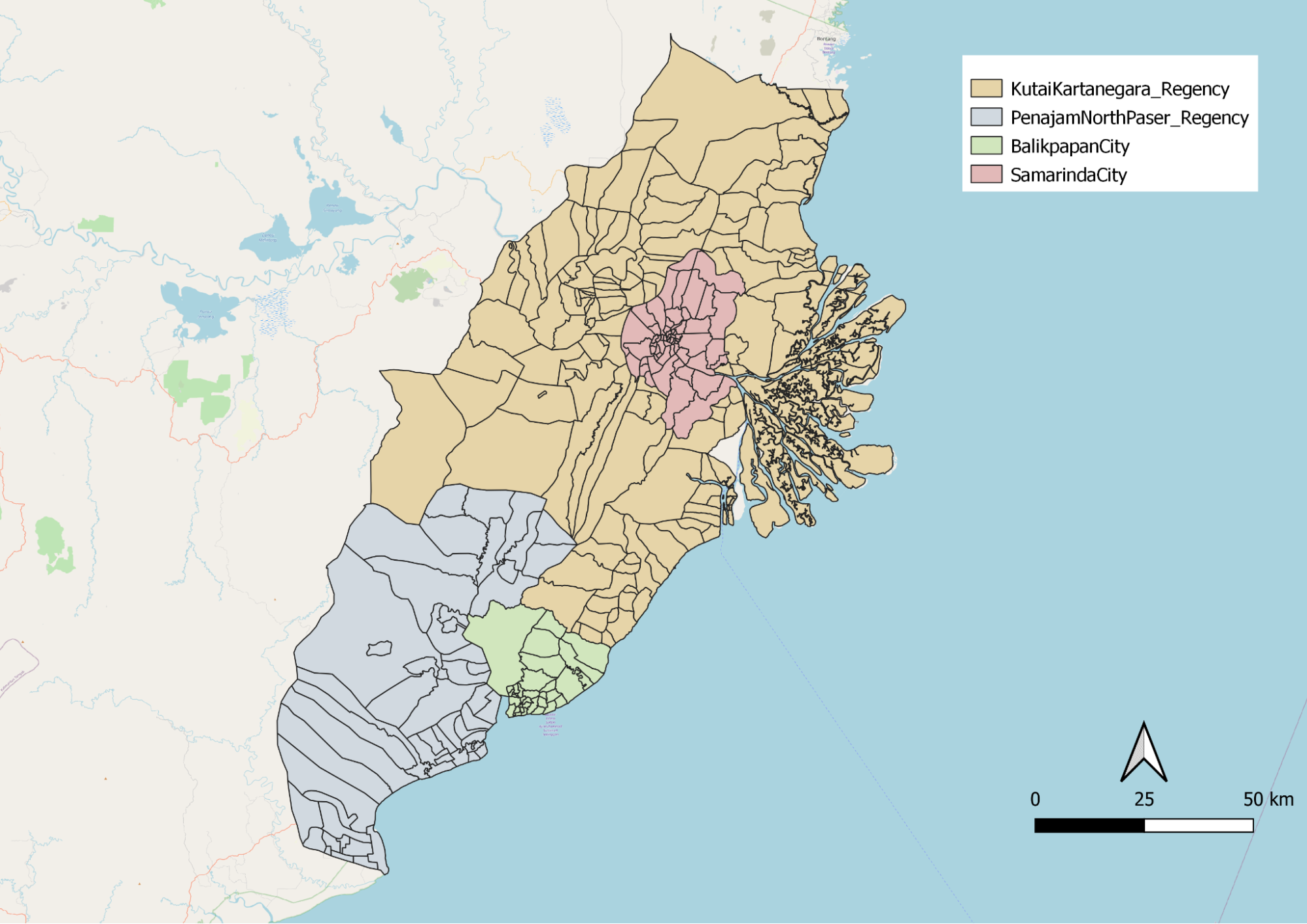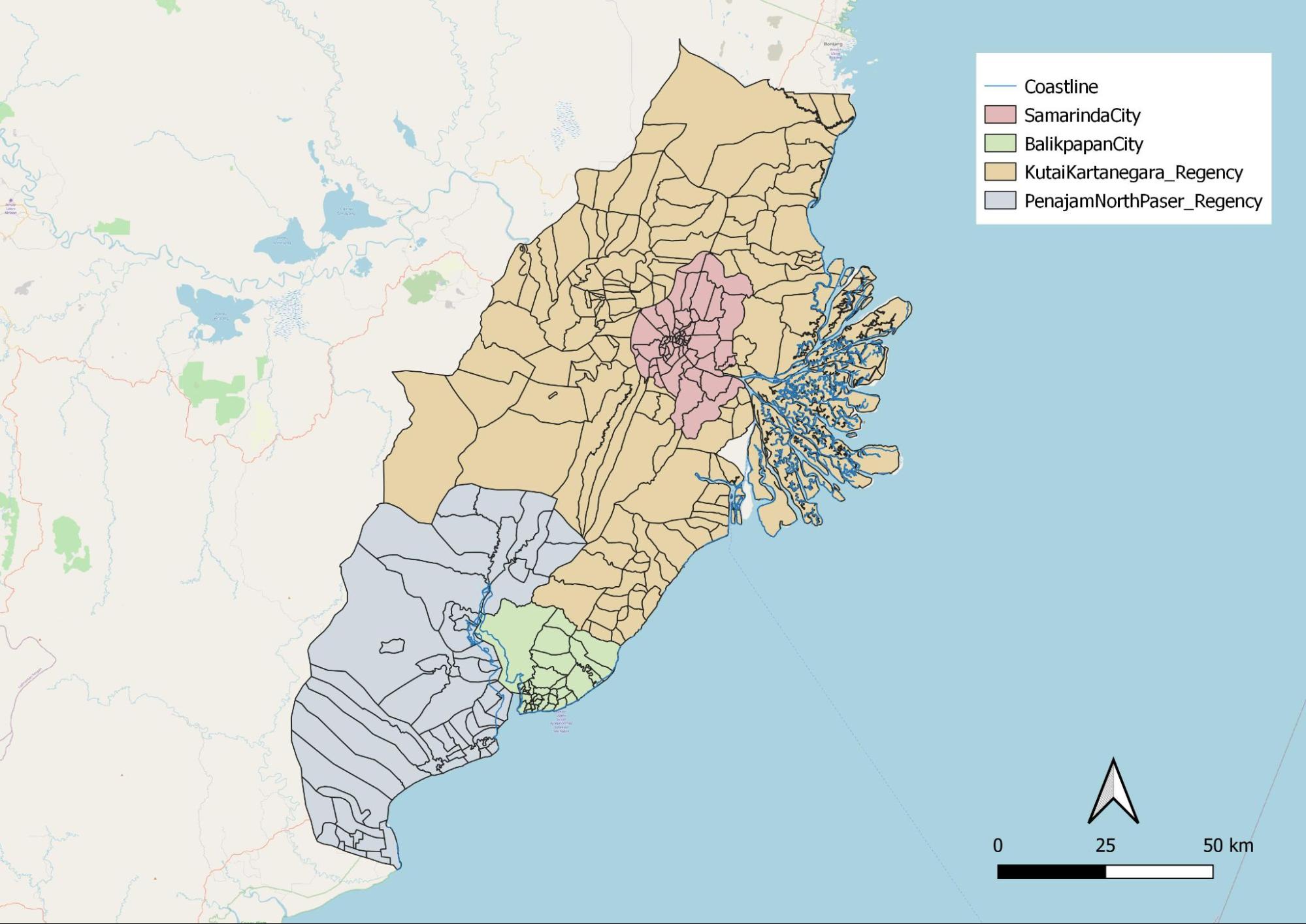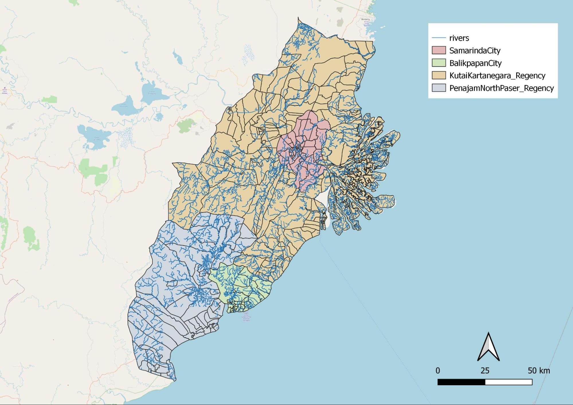 Rivers run through the 4 regions. As it was mentioned in task 2 that our area should avoid major rivers, we took this into consideration. However, it is quite obvious that rivers are very prominent throughout the whole of East Kalimantan.