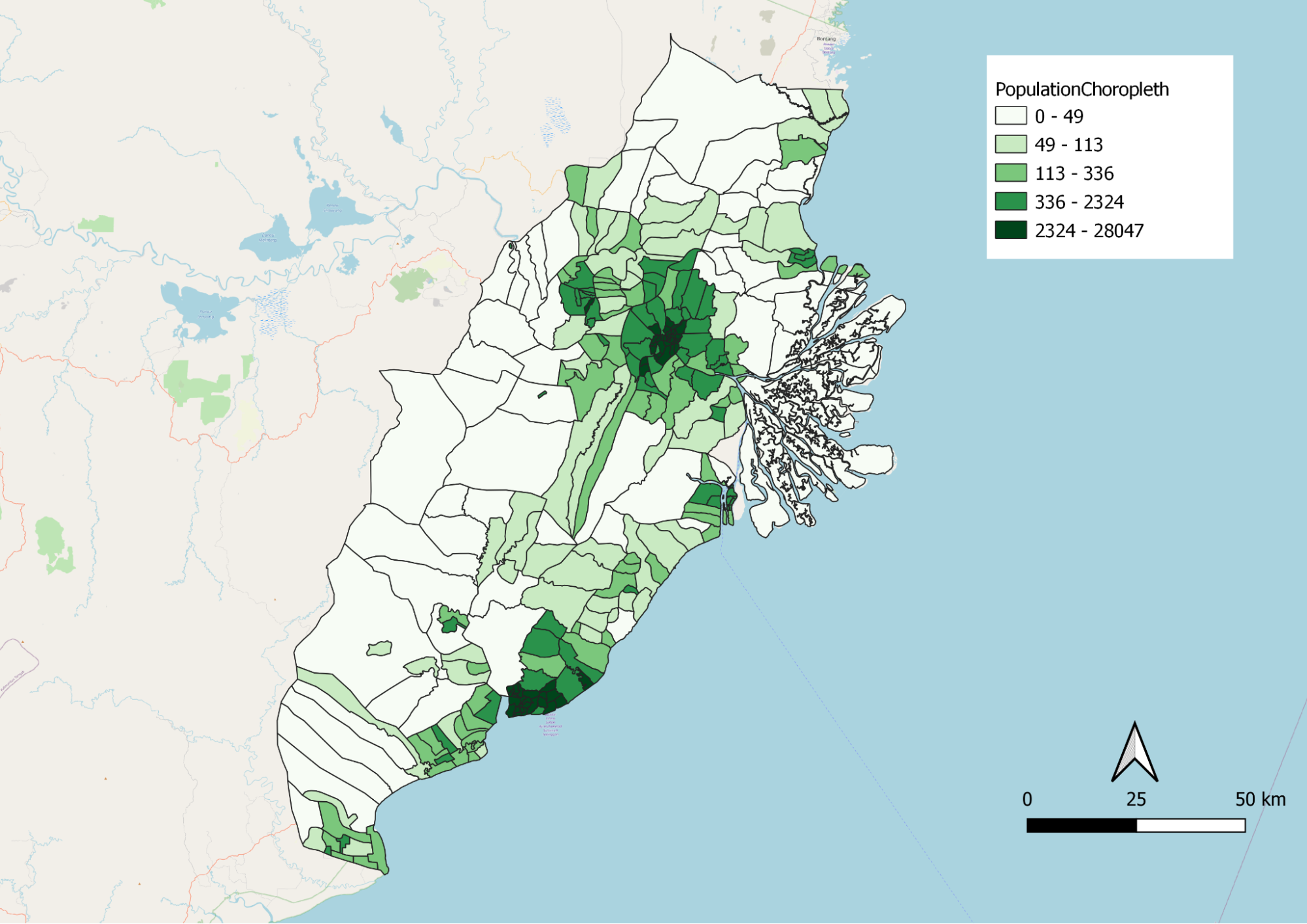 As our group is looking for a suitable site, we consider the population density across each sub district as one of the important factors to analyze the site suitability. Thus, using the data found in Balikpapan city, Samarinda city, North Penajam Paser regency and Kutai Kartanegara regency, we merge them altogether to map out our population density choropleth map. One interesting finding was that in city sub-districts such as Samarinda and Balikpapan, the population density tends to be higher, between 2324 to 28047 per sub district boundary. Contrastingly, we see a smaller population density across most of North Penajam Paser regency and Kutai Kartanegara regency sub-districts.