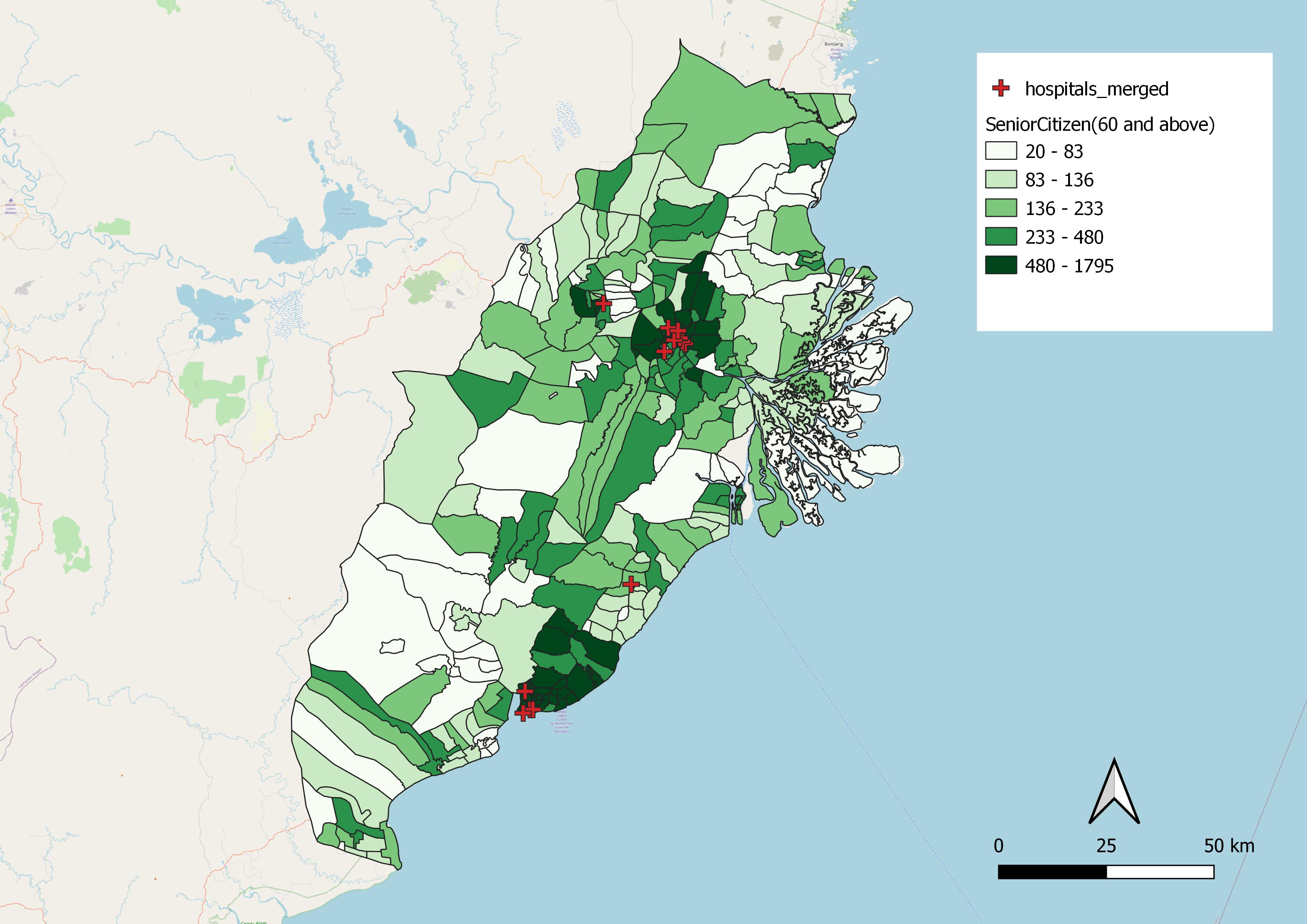 From the choropleth map shown in Figure 6b, we observed a similar trend where senior citizens aged 60 and above are heavily concentrated around city centres like Kota Samarinda and Kota Balikpapan. This can be attributed to reasons such as proximity to healthcare facilities, where healthcare facilities are more accessible in city centres as compared to the outskirts of the study area. In figure 6b above, we observed that hospitals are mostly situated in Samarinda and Balikpapan city, and there is a lack of healthcare facilities found in Kutai Kartanegara Regency and PenajamNorthPaser Regency. Thus, this relationship between proximity to hospital facilities and population within the senior citizens demographics are highly correlated.