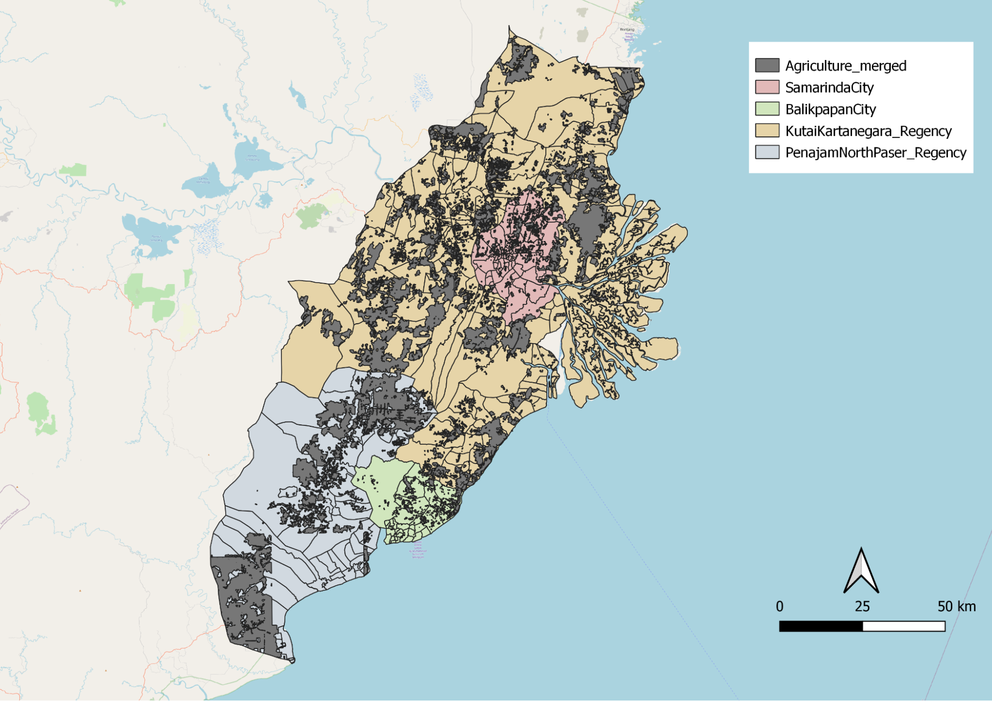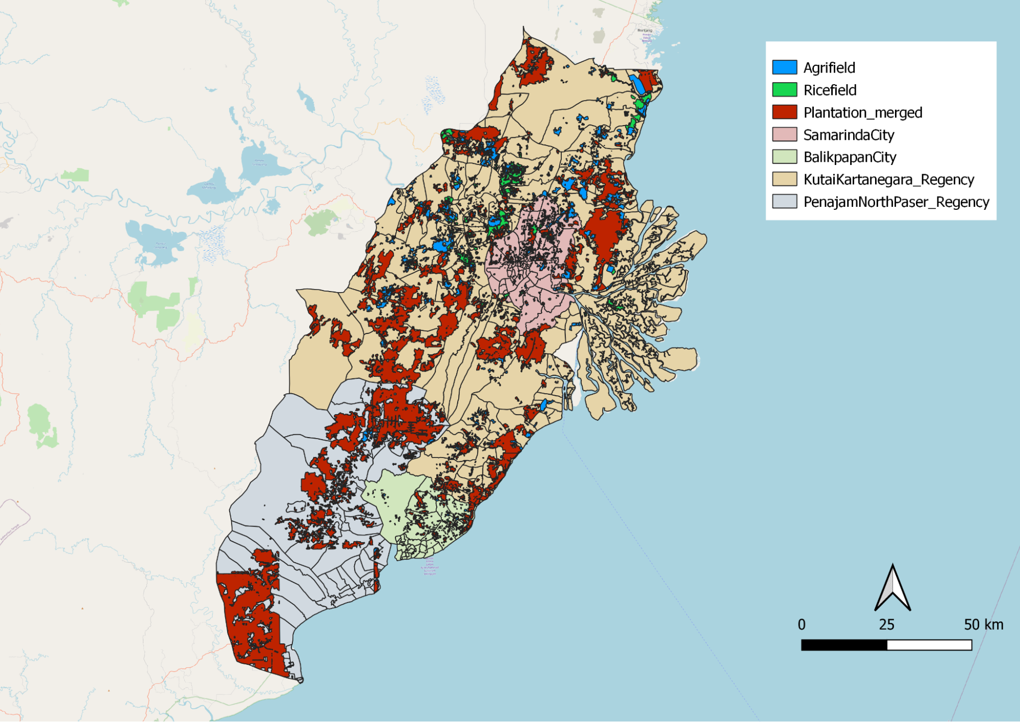 The agrifield layer represents Tegalan(dry-land) and Ladang (garden/bare land/ shifting land) which are known to be marginal land that has little or no agricultural or industrial value. We observed that agrifield is concentrated in Balikpapan, Samarinda and Kutai Kartanegara.