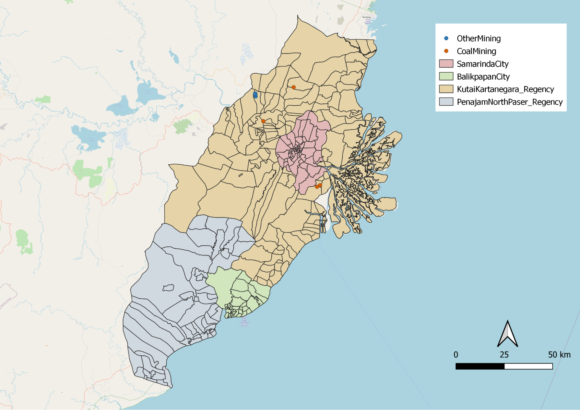 In East Kalimantan, mining contributes to the largest proportion in terms of GDP. From the data relating to mining that we found in our dataset, we classify them further into 3 categories which comprises Coal Mining, Other Mining and Surface Mining. We noticed that Coal Mining and other types of mining is apparent only in the Kutai Kartanegara Regency. For Surface Mining, it is only observed in the outskirts of Samarinda city and along the south-east region of Kutai Kartanegara Regency. In the study area of Penjamin Paser Utara and Balikpapan, there seems to be a lack of such land use in surface mining. Land used from mining activities could be a consideration when selecting the area for the city as it would involve additional economic cost to rehabilitate lands.