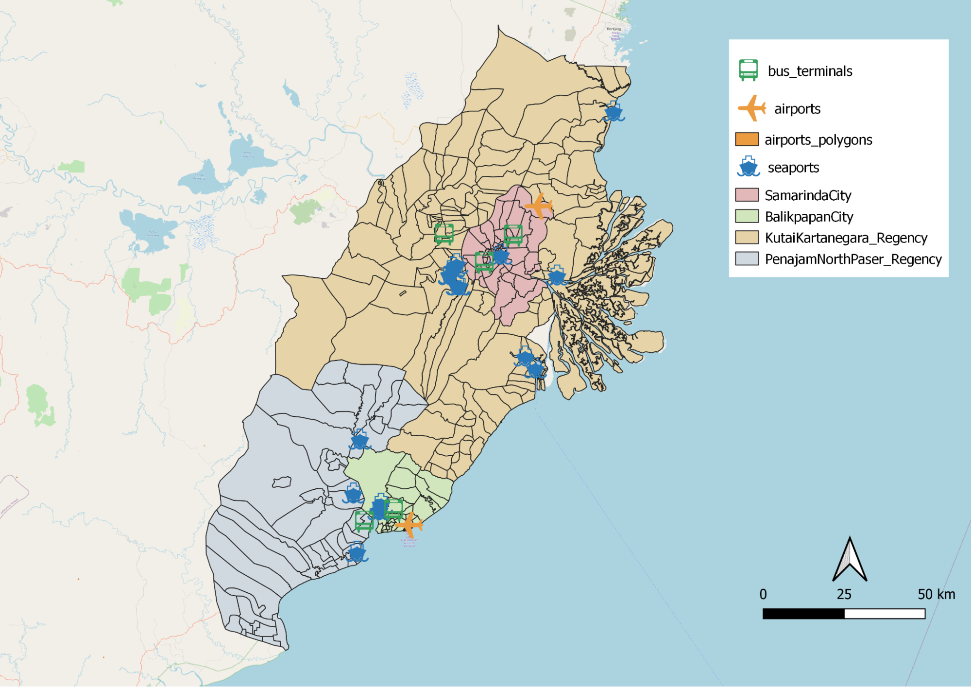 Figure 12 illustrates the distribution of different transportation services in our study area. There are only two airports, one within Balikpapan city and the other in Penajam North Paser regency, just outside of Samarinda city. The seaports are mostly situated within or just outside of Balikpapan city and Samarinda city. Similarly, the bus terminals are also found close to Balikpapan city and Samarinda city. Collectively, the different modes of transportations are mostly situated within or near Balikpapan city and Samarinda city. Even though there are transportation services found in Penajam North Paser regency and Kutai Kartanegara regency, those services are mainly located at the edges of the two cities. This shows that most of the transportation services are found in a close vicinity to the cities.