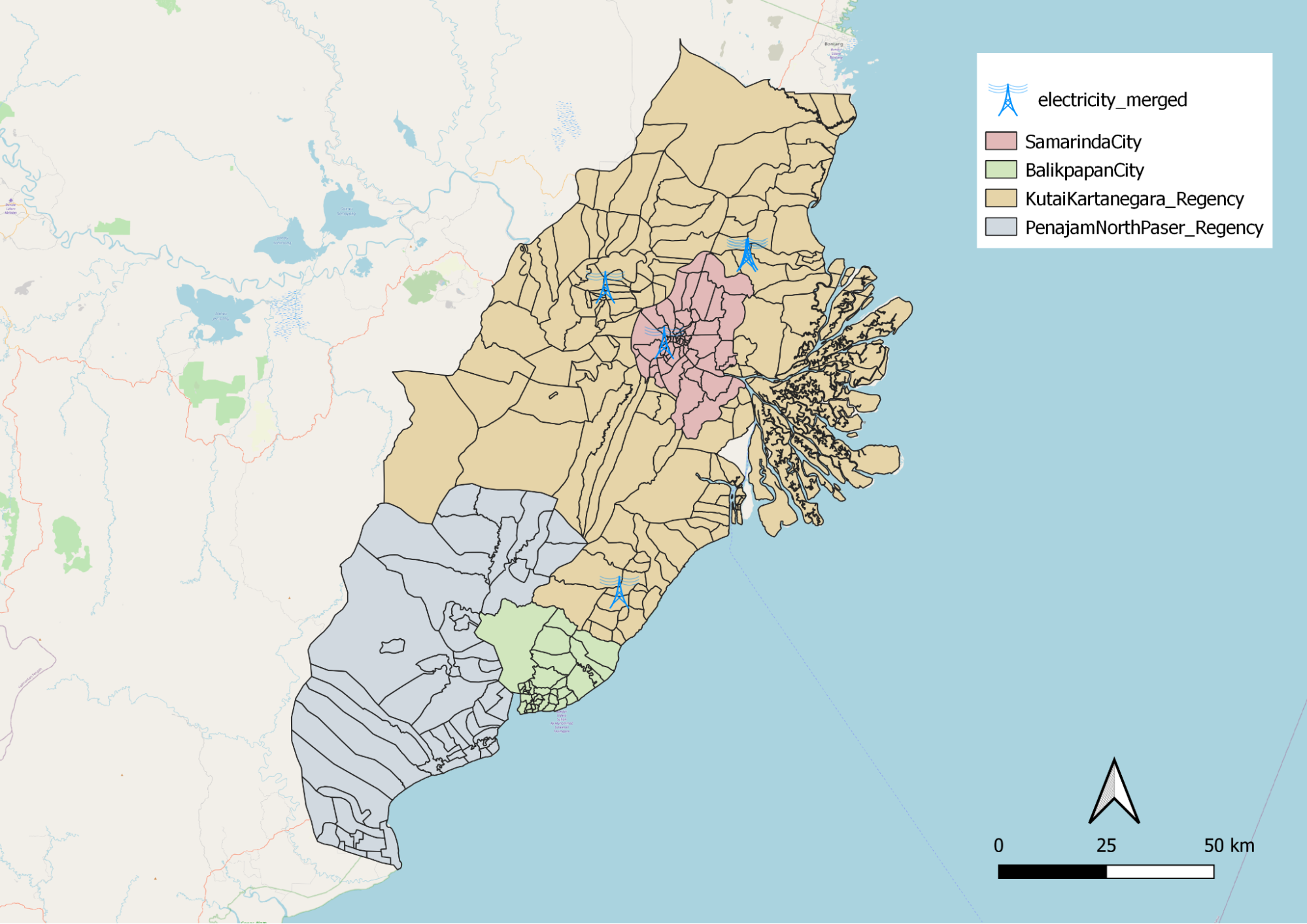 Electrical points are more prominent in Kota Samarinda and Kutai Kartanegara.These facilities provide infrastructure to further develop the country. It can be observed that the distribution of electrical towers are not evenly spread out as most of them are located in Kota Samarinda. This could be due to the fact that Kota Samarinda is the capital of East Kalimantan, and more modern buildings are located there.