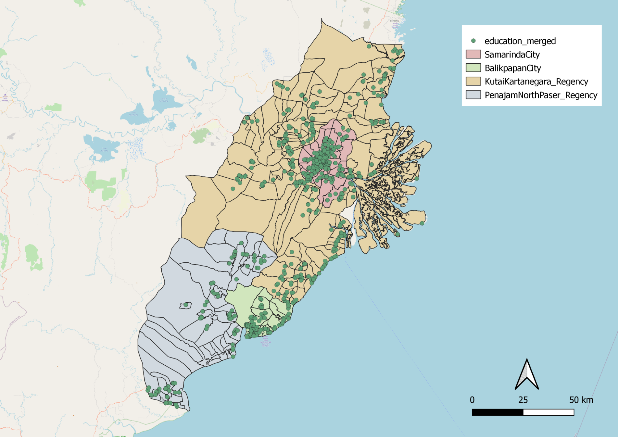 Similarly, Kota Samarinda and the coastline of Kota Balikpapan are densely populated with educational institutions. They are not evenly distributed. This might be due to the fact that Kota Samarinda and Kota Balikpapan have a higher population density.
